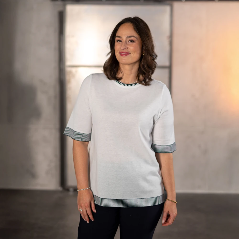 Wer den maritimen Stil liebt, aber gleichzeitig auch lieber uni trägt, ist mit diesem Modell gut bedient: Weiß im Rumpf hat der Pullover am Halsausschnitt und allen Säumen feine navyfarbene Ringel. Der Pullover hat einen kurzen Arm, ist glatt und gerade gestrickt. Passt super zu Sneakern, Jeans und Goldkettchen.