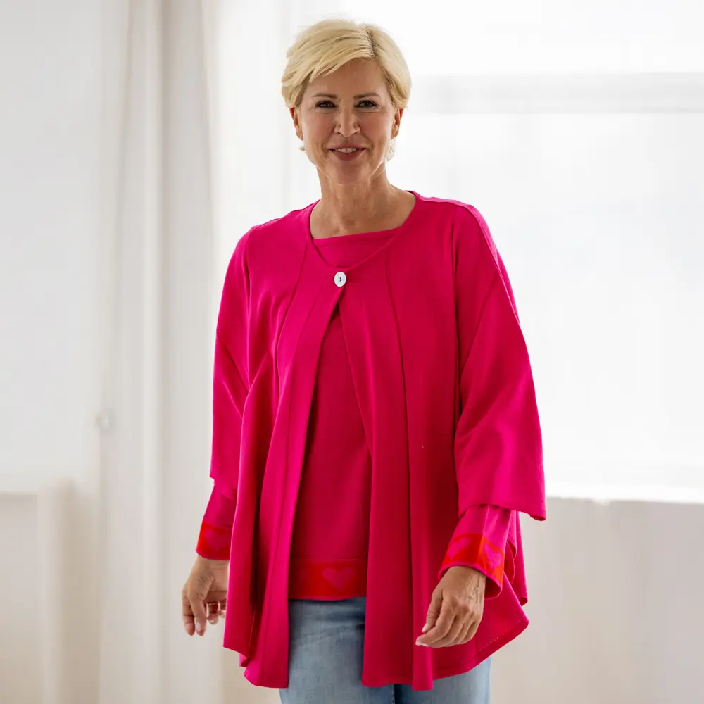 Ein wunderschönes Cape als Jacken- oder Boleroersatz, perfekt für den Übergang, laue Sommernächte oder Festlichkeiten. Schnell übergeworfen ist es ein Teil, das zu jeder Garderobe passt. Glatt gestrickt mit feinen vertikalen Streifen, die durch linke Maschen entstehen. Am runden Halsausschnitt hält ein schöner Perlmuttknopf alles zusammen. An den Seiten gibt es kurze Nähte.