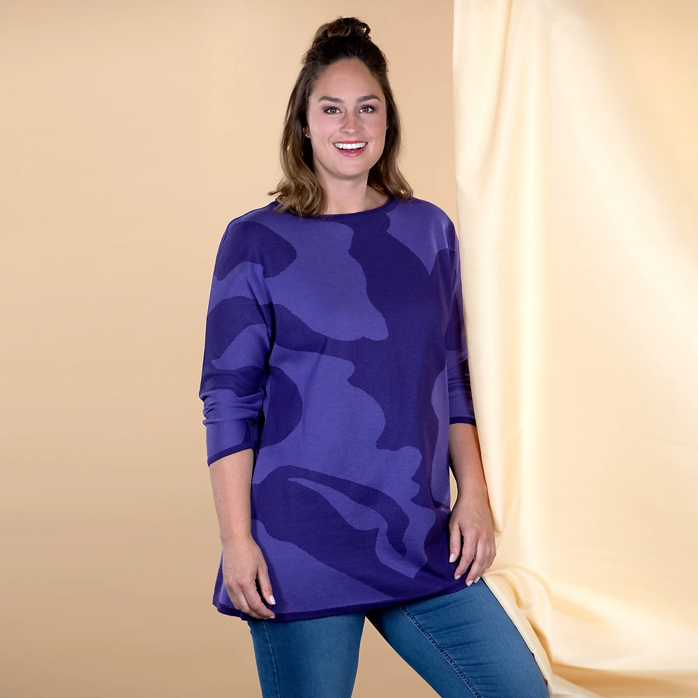 Wer auf Muster steht, wird diese Tunika lieben. Das von uns kreierte Camouflage Muster zeigt sich hier in sanften Kontrasten. Die Tunika ist großzügig geschnitten, was durch die Fledermaus-Ärmel verstärkt wird.