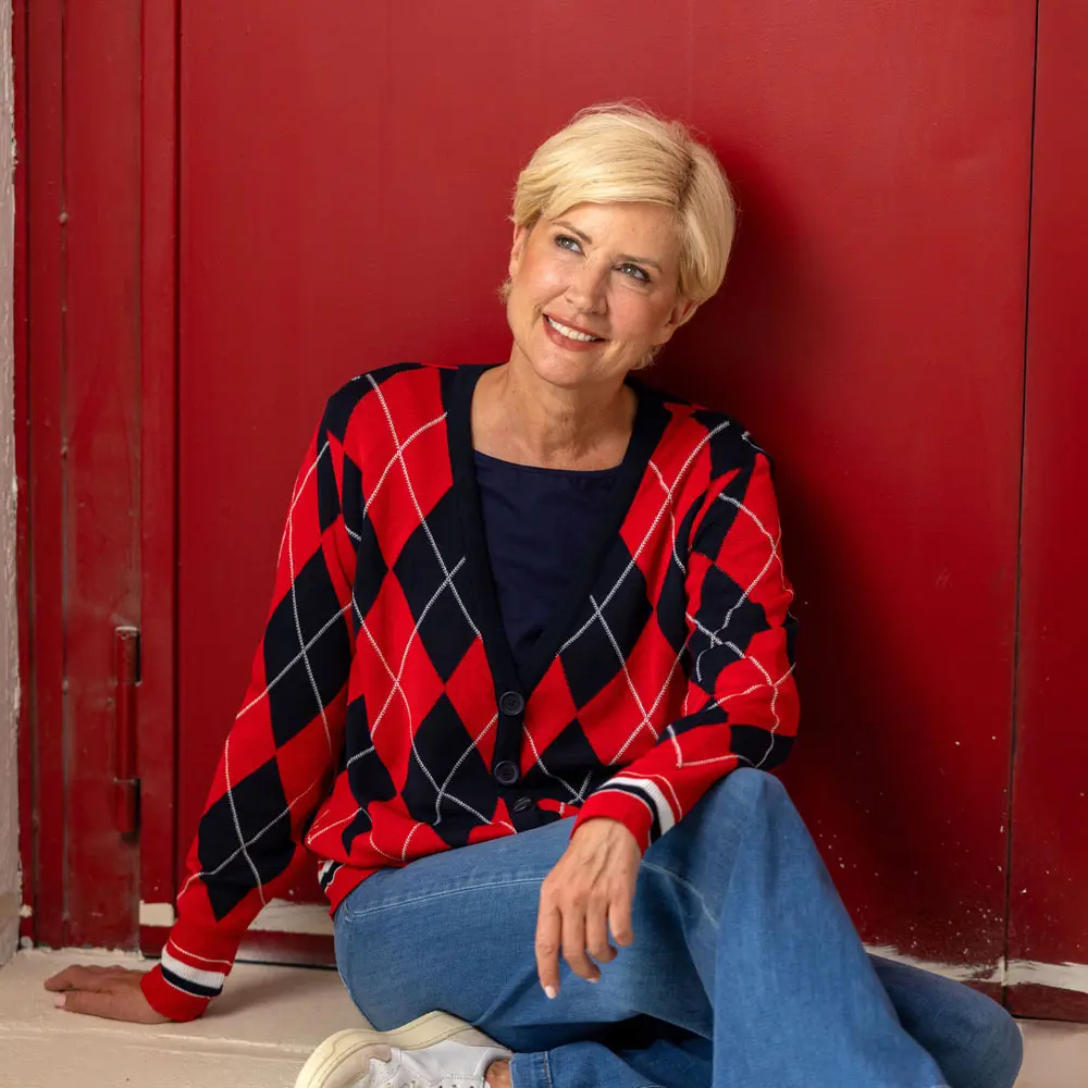 Diese Strickjacke verbindet ein markantes Argyle-Muster mit einer lockeren, modernen Silhouette. Eingesetzte Ärmel und der V-Ausschnitt sorgen für einen entspannten, vielseitigen Look. Dies bringt den Charme des British-Country-Style in die moderne Garderobe. Feine Rippenbündchen an Saum und Ärmeln bieten zusätzlichen Komfort. Ein vielseitiges Kleidungsstück, das sich ideal in den Alltag integrieren lässt. Ob zu Jeans oder einer eleganten Stoffhose, sie verleiht jedem Outfit eine klassische Note. Perfekt für Frauen, die den britischen Stil lieben.