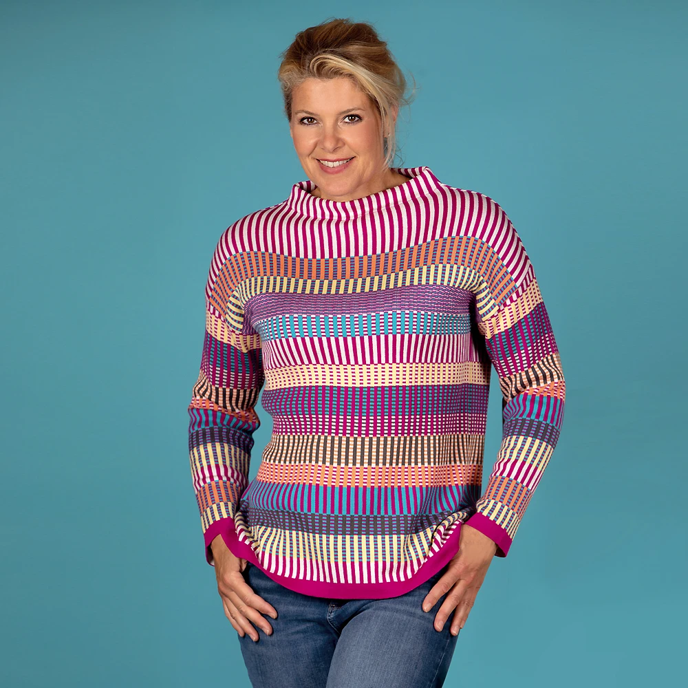 Dieser Multicolour-Look überzeugt mit der Farbvielfalt und einem zeitgemäßem Schnitt: Etwas Kastig, angesetzte Ärmel und ein Stehkragen. Der Jaquard ist etwas dicker durch die Strickart, perfekt für kältere Tage. Super zu kombinieren mit Jeans oder wer mag, einer bunten Hose. Passend dazu gibt es übrigens auch den Schal 22417.