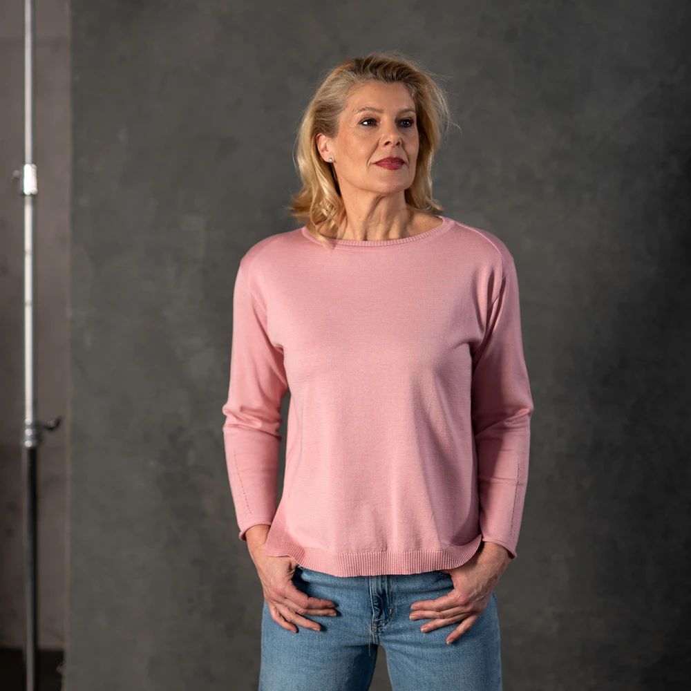 U-Boot-Ausschnitte zaubern ja bekanntlich eine feine Silhouette. Der lässige Look entsteht durch den lockeren Schnitt, die feinen Ripp-Bündchen und die aufwendige Strickart aus einem Wechsel aus glattem Strick und feiner Rippe.