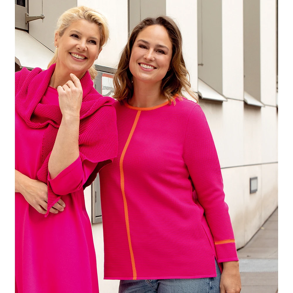 Ein Pullover in Biesen-Struktur ist immer gut, denn er fühlt sich griffig an, fällt aber weich. Die Passform ist eher leger durch den geraden Schnitt. Eingesetzte Ärmel geben Ihren Schultern eine schöne Kontur. Kontrast gibt ein Streifen vorne, an den Ärmeln und am Ausschnitt.