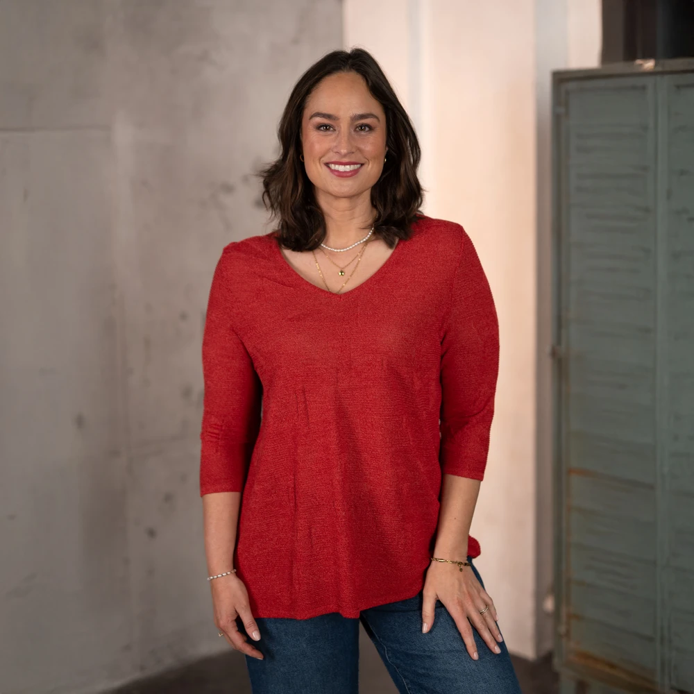 Diese A-Form Tunika ist aus leichter, kühlender Viskose und somit perfekt für warme Sommertage. Der V-Ausschnitt und die 3/4 Ärmel zaubern tolle Proportionen. Das Strickmuster ist aus einer feinen Biesenstruktur mit sich absetzenden Buchstaben.